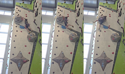 " After taking a break from climbing earlier this summer for medical reasons, I’m thrilled to be back on the wall, climbing better than ever. Here’s me on one of my favorite current routes at the gym, a dynamic one with lots of jumps. Being able to climb gives me that weekly adrenaline boost, helps push my comfort zone, and be a part of a great community. "