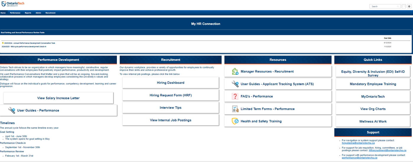 The employee dashboard in My HR Connection will provide you access to your recruitment profile. This will enable you to view job offers, internal job postings including other recruitment resources.